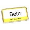 Large rounded rectangular name badge – gold border.