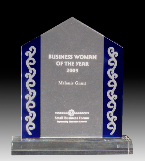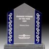 An acrylic award with a clear midsection between two blue strips that have a carved decorative design.