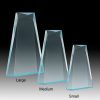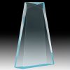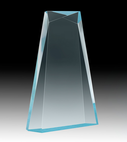 Clear faceted, self standing acrylic award with blue highlights on the base that reflect across the award.