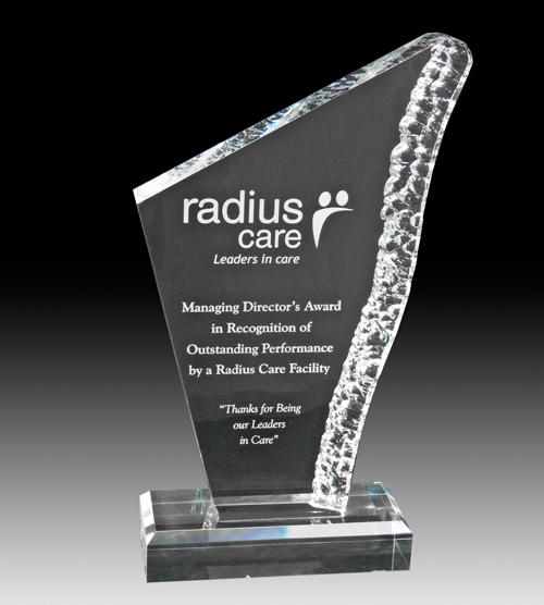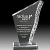 Clear acrylic award in an upright triangular shape, with a frosted and rippled right side edge.