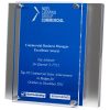 A self standing acrylic award, with silver strips either side of a blue mid section. There is a clear acrylic plate screwed to the front slightly offset from the back.