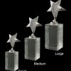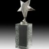 Clear glass rectangle with two patterned sides and a large silver metal star fixed on the top.