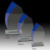 Curved clear glass pane with a blue glass stepped right edge set on a clear glass base.