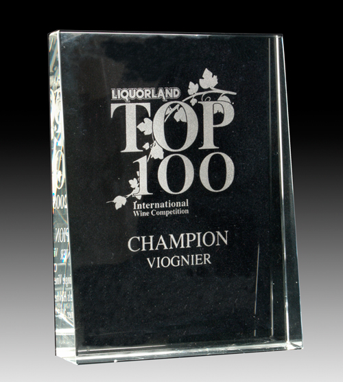 Rectangular clear crystal award with a wide base tapering to a thinner top edge.
