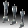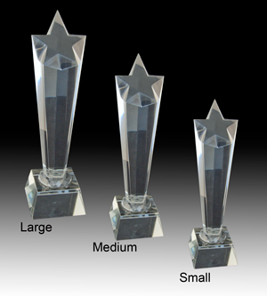 A crystal tapered base with a diamond cut ring on top, supports a hexagonal column shaped as a star.