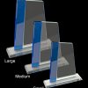 Clear glass panel with a narrow strip of blue glass down one side, set on a clear glass base.