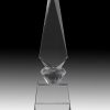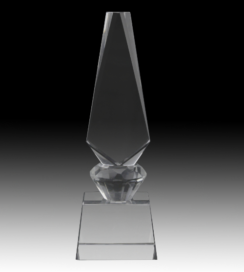 A clear crystal award with angular sides and bevelled edges.