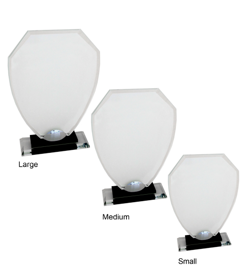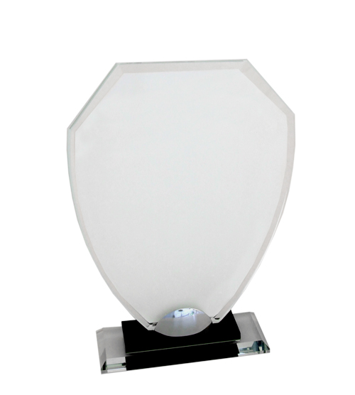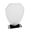 Serena Glass Award with a metal support fixed onto a small black base set on top of a clear base.