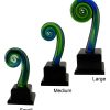 Hand crafted glass shaped like a furled fern on satin black square base.
