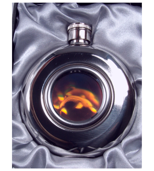 Stainless Steel 5oz / 140ml circular Hip Flask with a Dolphin design on the front and back.