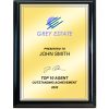 Plaque with black lacquer finish. Includes full colour text or image printed onto a gold aluminium plate and fixed to the front of the plaque.