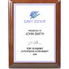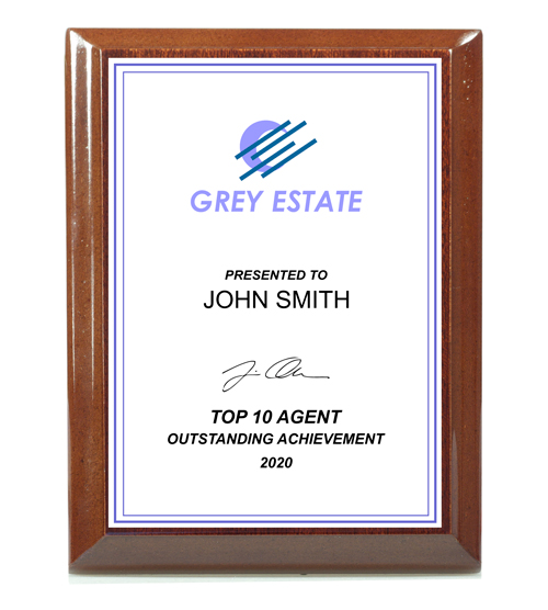 Plaque with dark walnut super gloss veneer. Includes full colour text or image printed onto a white aluminium plate and fixed to the front of the plaque.
