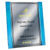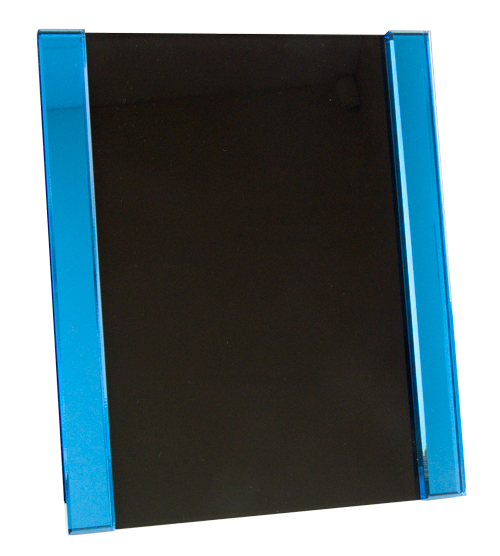 Blue highlight either side of a clear acrylic plaque with a black coating on the back. Includes full colour text or image printed / engraving onto an aluminium plate and fixed to the front of the plaque. Gold, Silver and White aluminium is available to select from.
