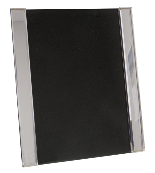 Silver highlight either side of a clear acrylic plaque with a black coating on the back. Includes full colour text or image printed / engraving onto an aluminium plate and fixed to the front of the plaque. Gold, Silver and White aluminium is available to select from.
