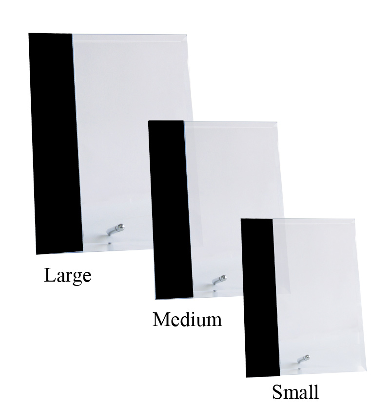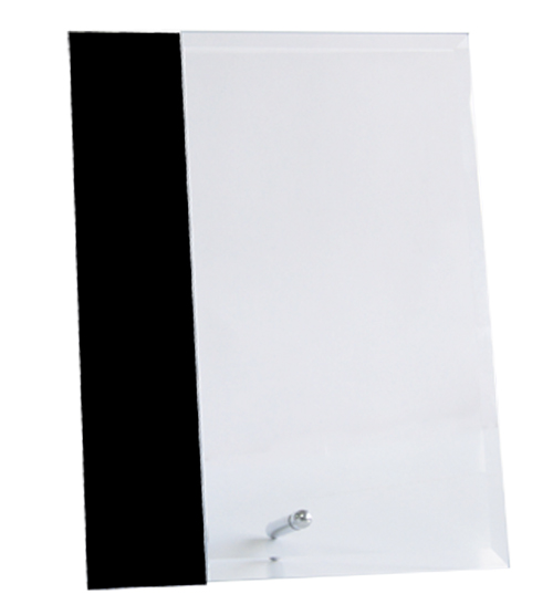 Self standing clear glass plaque with a black glass column on the left, supported by a metal rod. Includes full colour text or image printed onto an aluminium plate and fixed to the front of the plaque. Gold, Silver and White aluminium is available to select from.