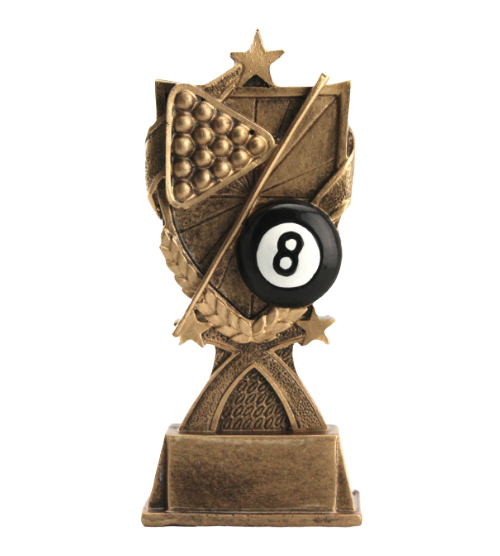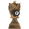 Bronze billiards resin award with rack, cue and coloured 8-ball molded from resin as one unit.