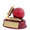 Red cricket ball with bronze bails set on a gloss base, molded from resin as one unit.
