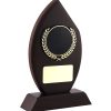 Wooden flame shaped award with a 50mm dia. black and gold image holder.