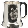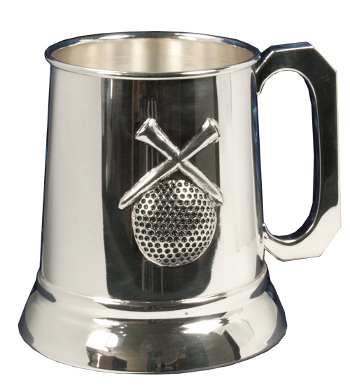 Silver plated beer tankard with two tees and a golf ball in relief on the front. Comes packaged in a blue box with a blue satin lining. A black wood box with black satin is an optional extra.
