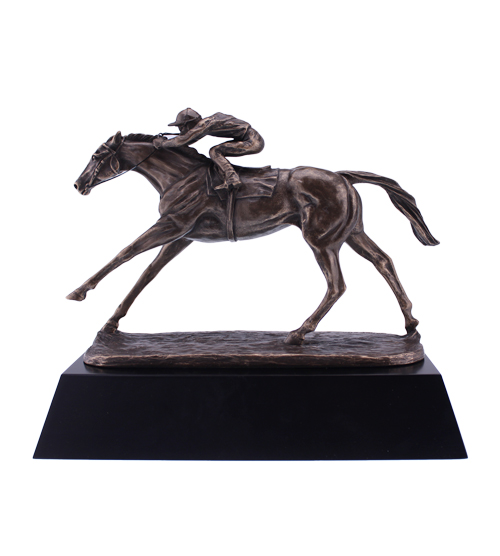 Resin Horse & Jockey with bronze finish on an MDF black tapered base.