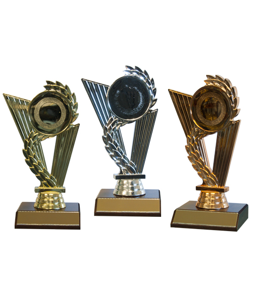 Gold, Silver & Bronze with wreath design, plastic holder.