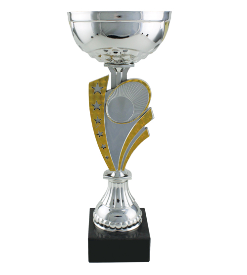 Silver metal bowl with gold detailing. Includes a space for an image insert. The cup is mounted on a black marble base.