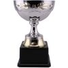 Solid metal bowl, with a silver exterior and gold interior. The front of the cup has hollow floral patterns. The cup is mounted on a black plastic base.