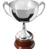 An elegant trophy cup set on a round wood base finished with a cherry veneer.