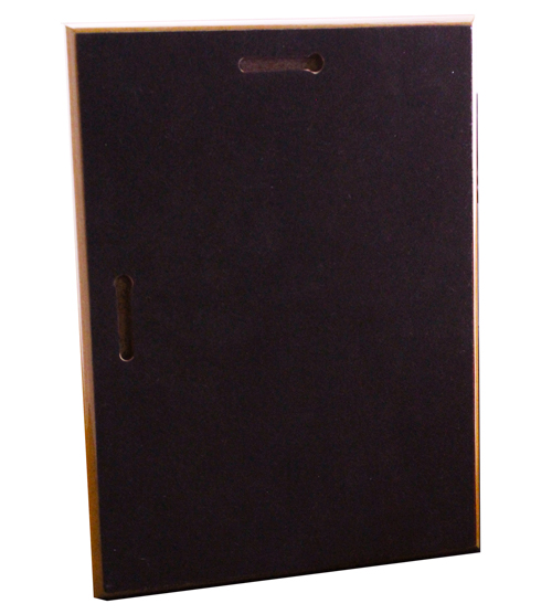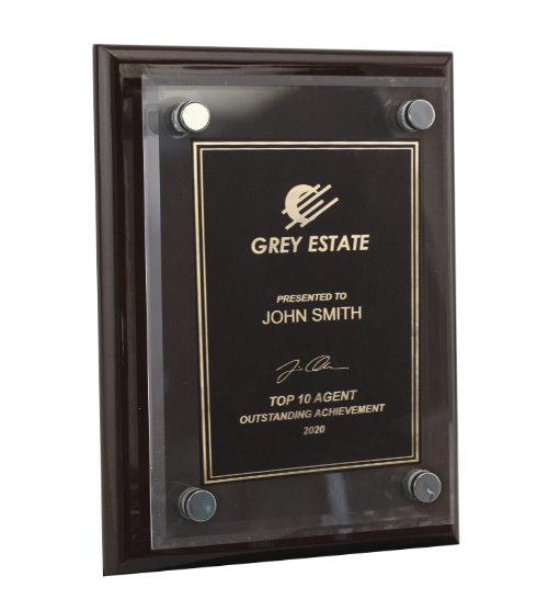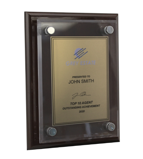 Premium High Gloss Walnut Finish plaque with clear acrylic standing off from from the back.